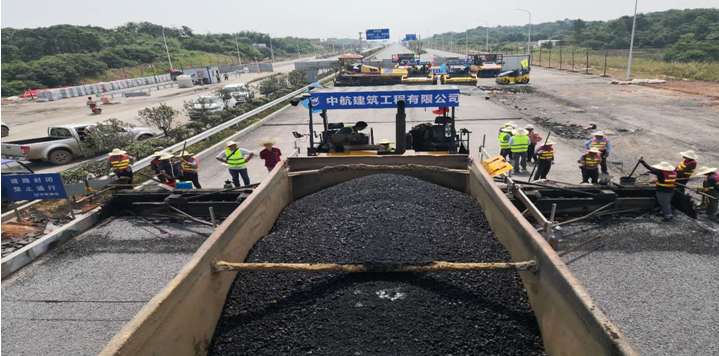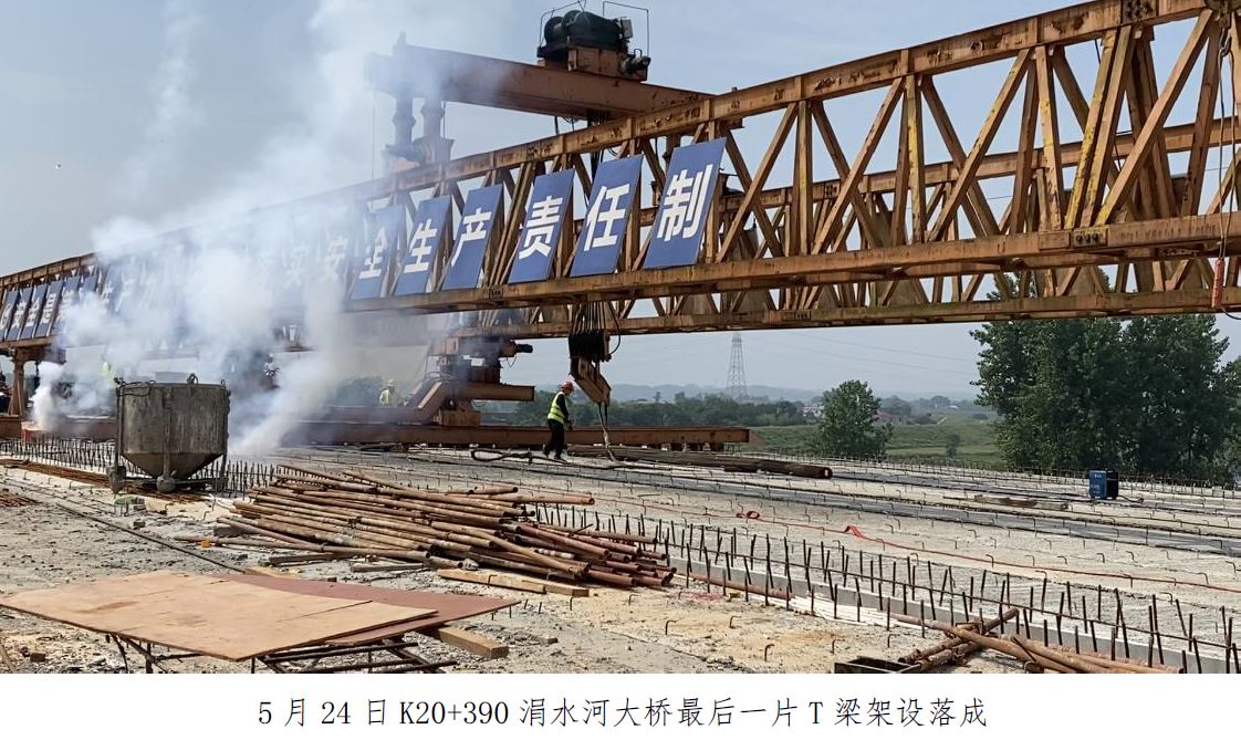 2020年5月,中航建筑天易示范區(qū)物流園市政PPP項目迎來疫情后的第二個春天,生機勃勃之景象展現(xiàn)世人:5月22日,第一階段(K12+320-K15+000)工程順利竣工驗收;5月23日第二階段的路面層瀝青混凝土開始攤鋪;5月24日,控制性工程K20+390涓水河大橋最后一片T梁架設(shè)順利落成,橋梁梁板全幅貫通。這一樁樁具有標志性的事件如一簇簇火紅石榴花滑過被四月洗禮后的清澈天空,特別耀眼。