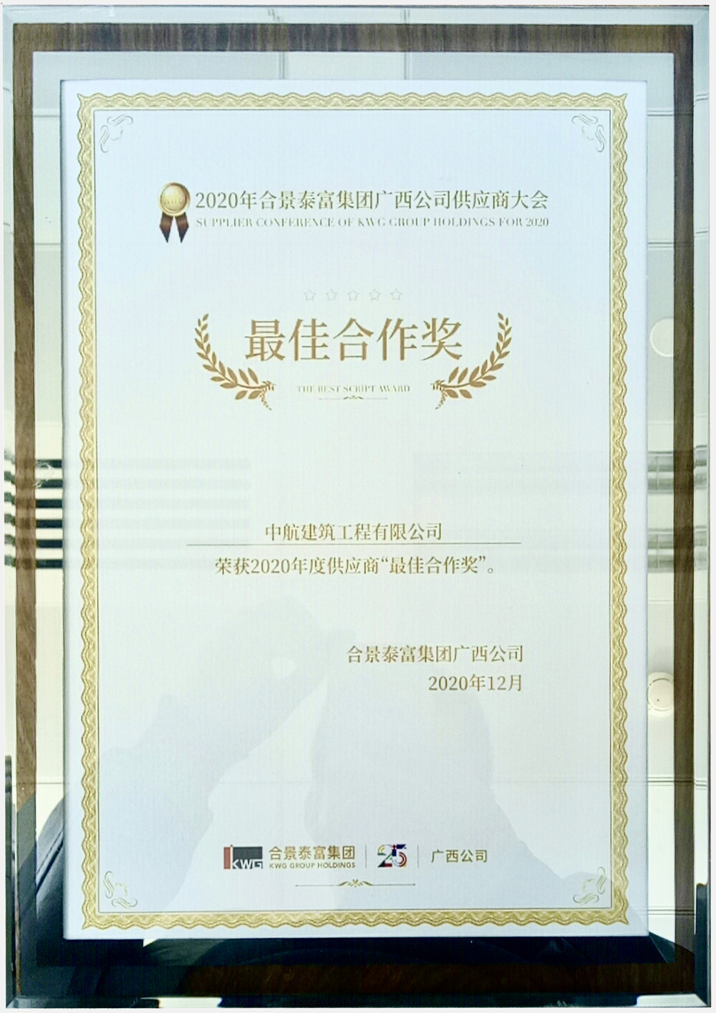 公司榮獲合景泰富集團廣西公司2020年度供應(yīng)商“最佳合作獎”。
