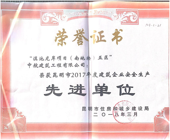 2018年04月03日,昆明市住房和城鄉(xiāng)建設(shè)局組織召開(kāi)昆明市2017年度建設(shè)工程質(zhì)量管理、安全生產(chǎn)、文明施工及揚(yáng)塵治理管控總結(jié)暨2018年工作部署會(huì)議。我司通過(guò)承建昆明滇池龍岸五區(qū)項(xiàng)目獲得《昆明市2017年建筑企業(yè)安全生產(chǎn)先進(jìn)單位》稱號(hào)。